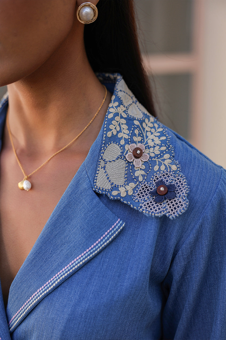 This Jacket Style Co-ord Set is made using soft Tencel Denim, featuring a beautifully embroidered cutwork collar with dori work and 3D flowers.