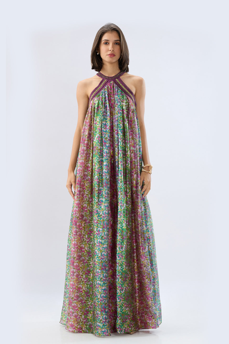 This halter neck maxi dress comes in a sheer, flowing organza fabric with vibrant floral print. The neckline is enhanced with intricate bead embroidery. Ideal for resort escapes, cocktail evenings, or festive celebrations.