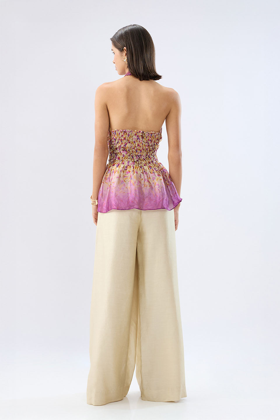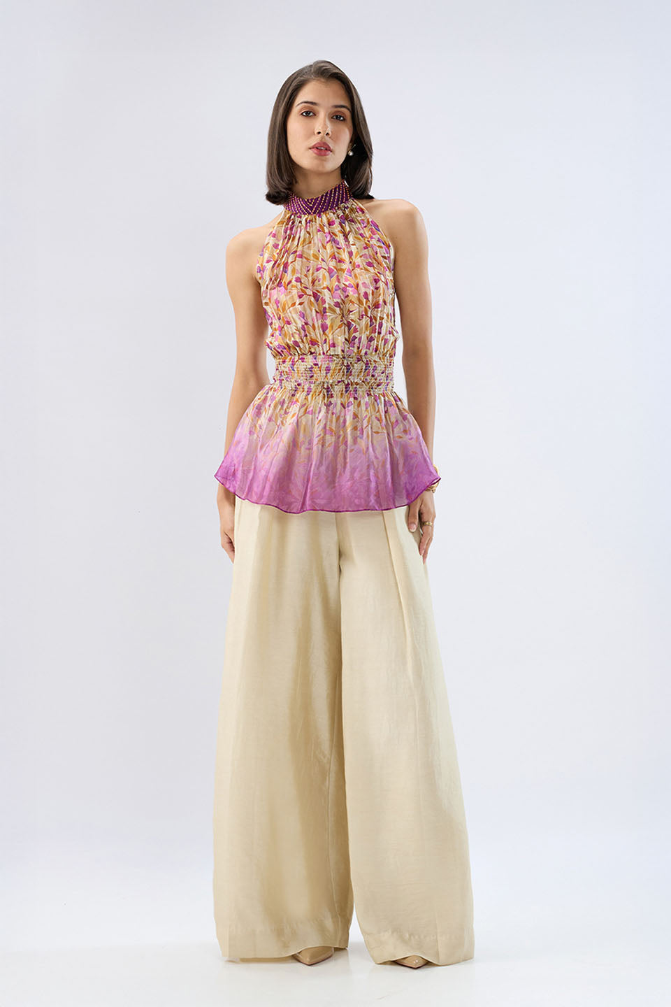 This 2 piece co-ord set comes with a halter-neck top with intricate bead embroidery at the neckline, smocked waist for a flattering fit with peplum hem in delicate floral print. It is paired with pleated flared pants. Ideal for festive gatherings, evening soirées, or destination celebrations.