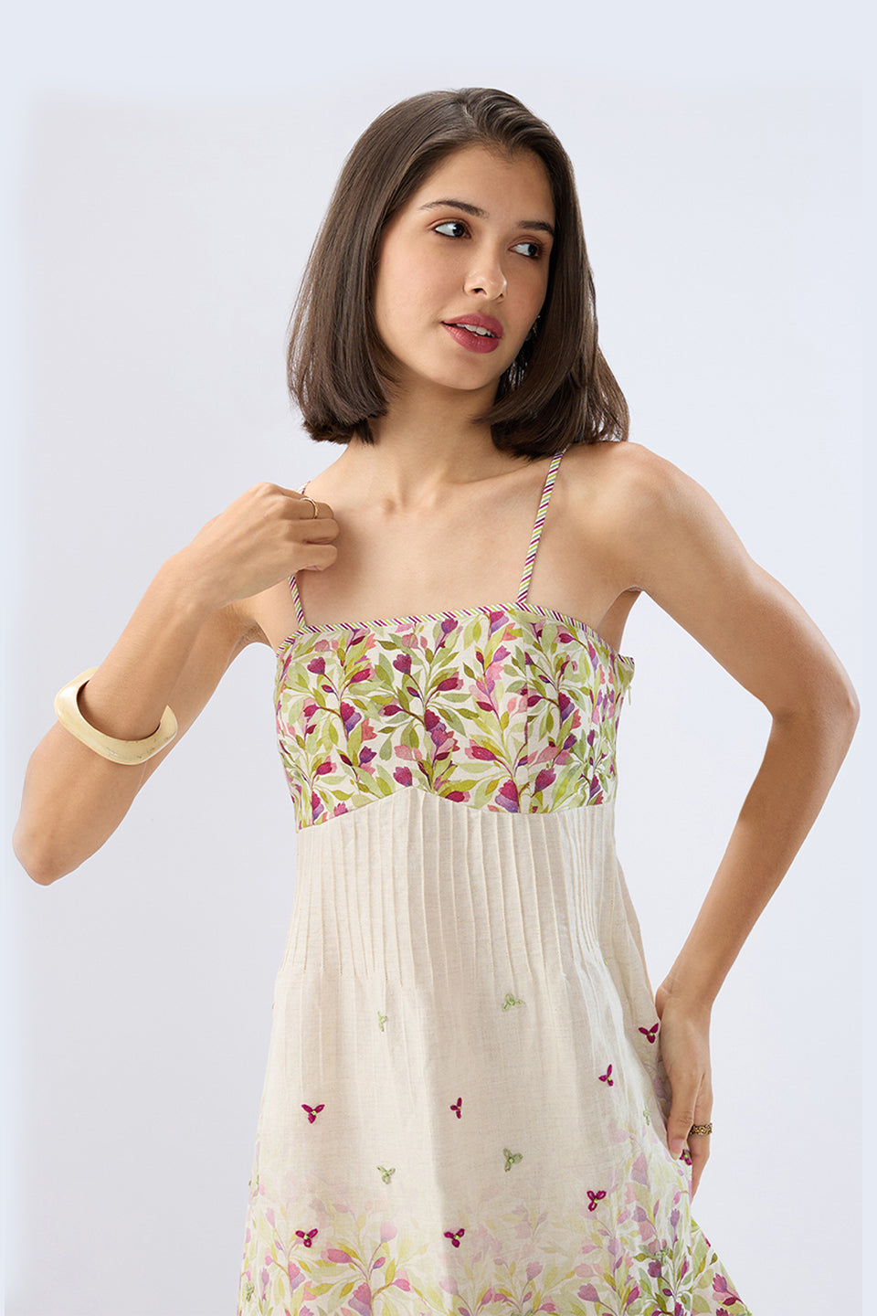 This A line short dress comes in floral print with pintuck detailing. It is enhanced with delicate thread work embroidery. Ideal for casual outings and brunch dates.