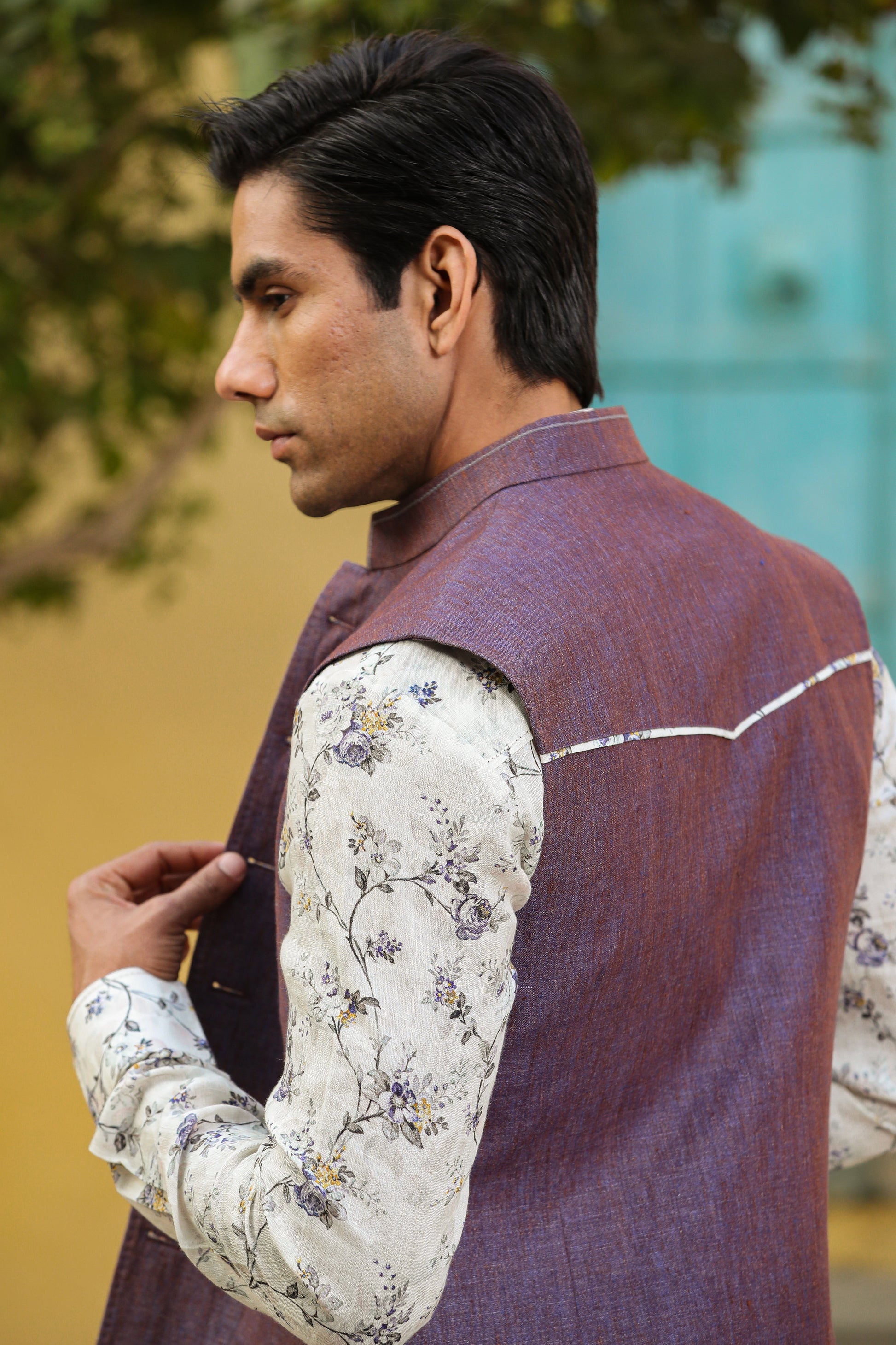 The Design includes a uniquely crafted Bandi with back yoke and floral piping with 3 flap pockets and double side vent.