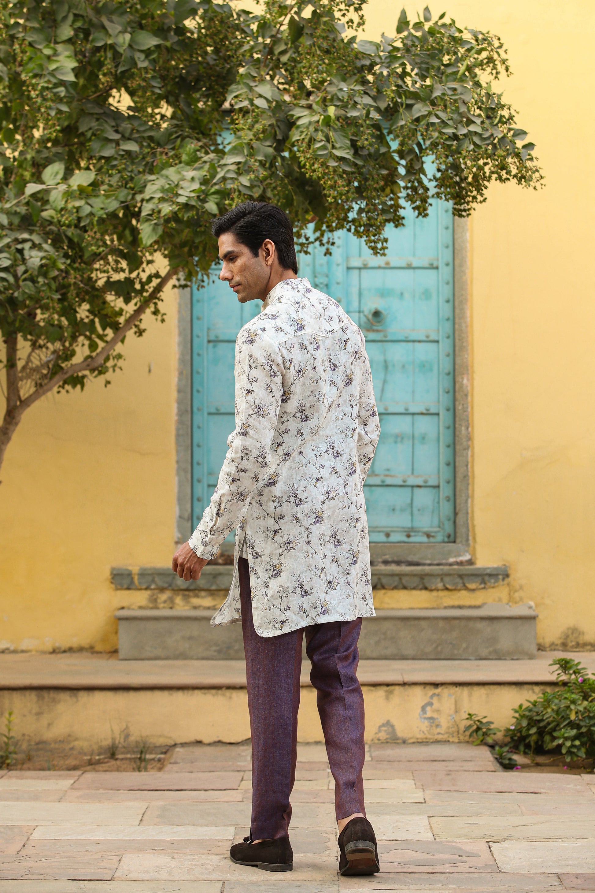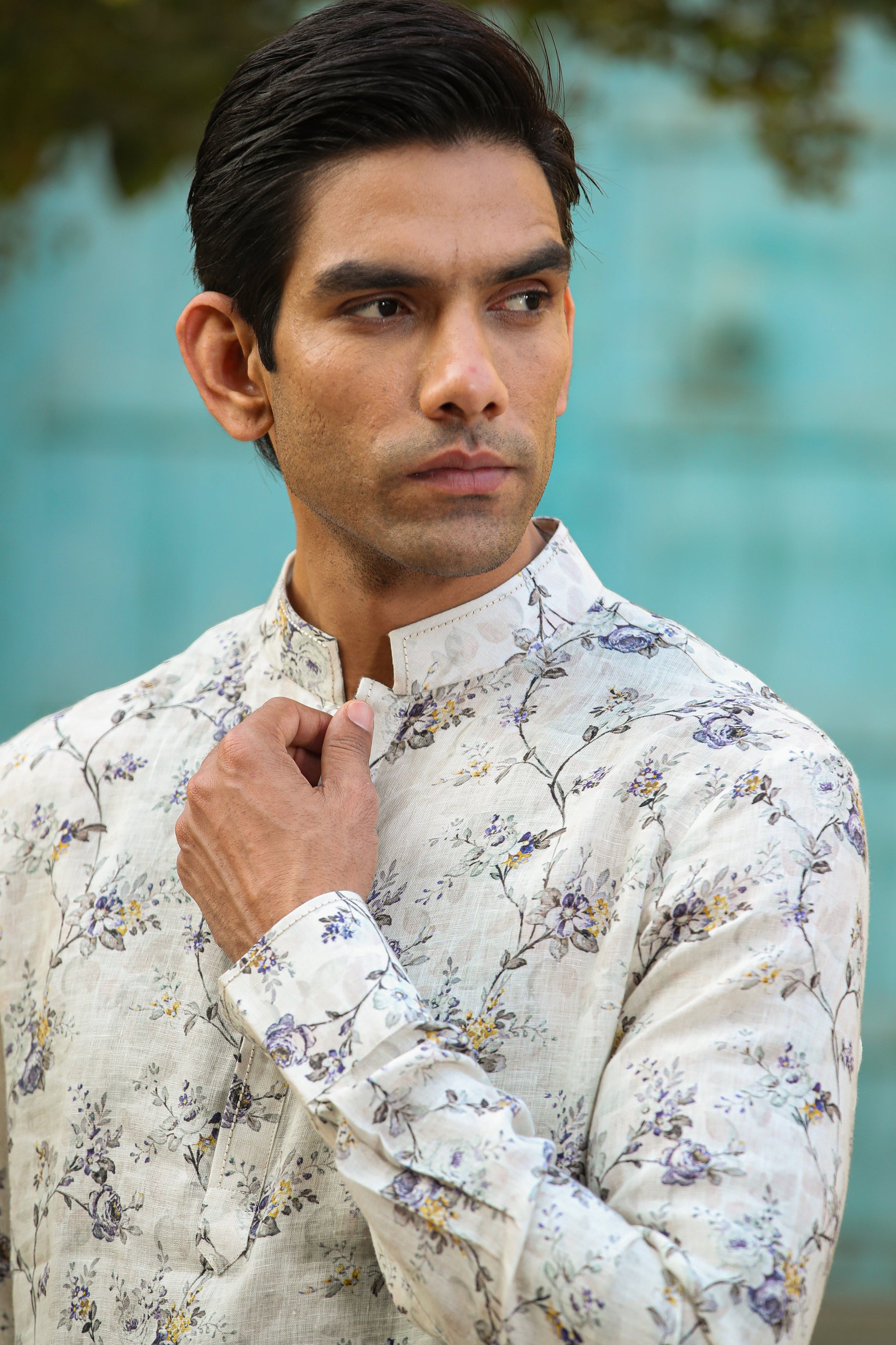 Paired with Floral Printed Kurta with intricate thread work on neck and sleeves and matching Straight Linen Pants.