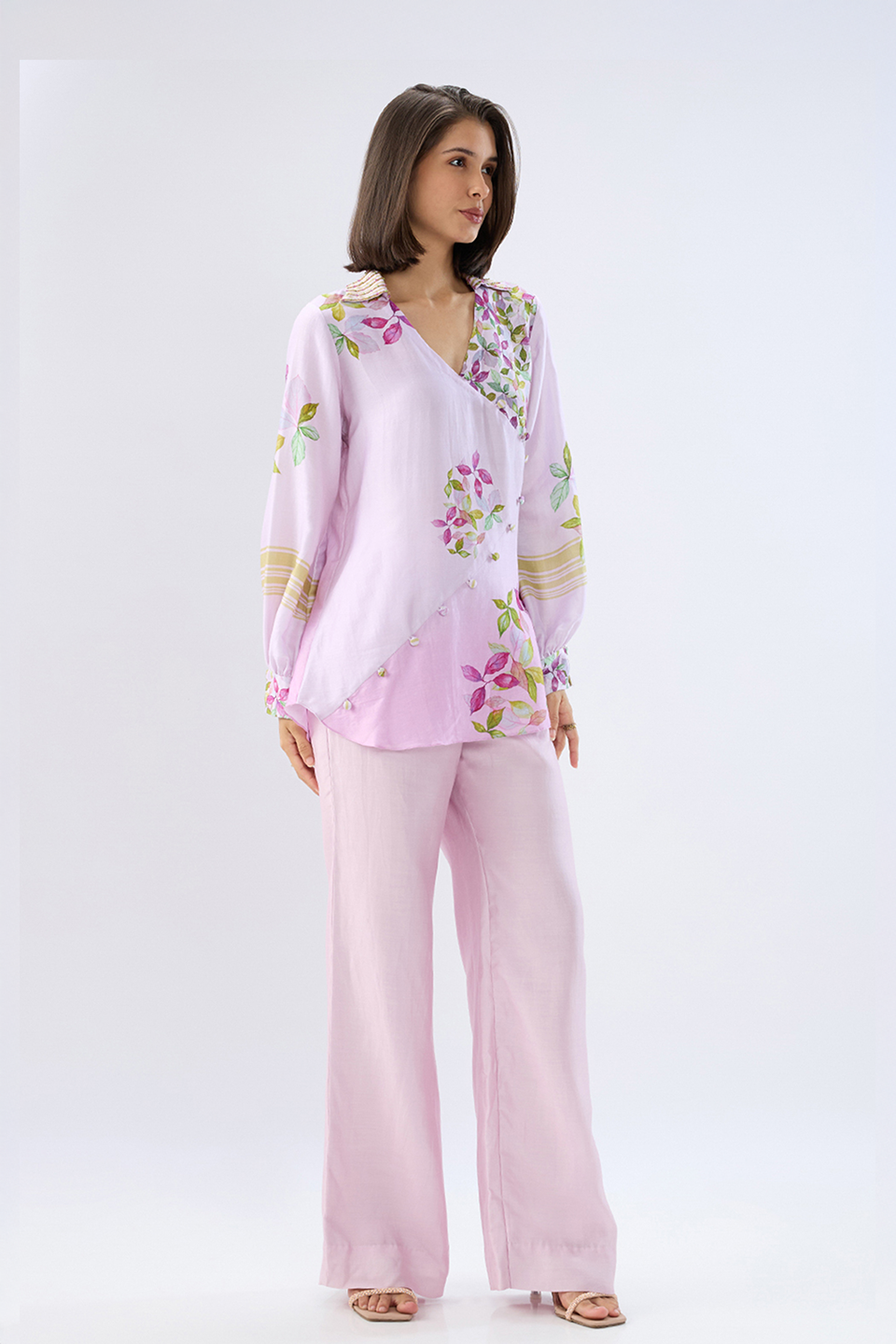 This 2 piece co-ord set comes with a delicate floral printed top with a v neck collared neckline, fullsleeves with cuffs. It is paired with flared pants. Ideal for brunches, vacations and casual outings.