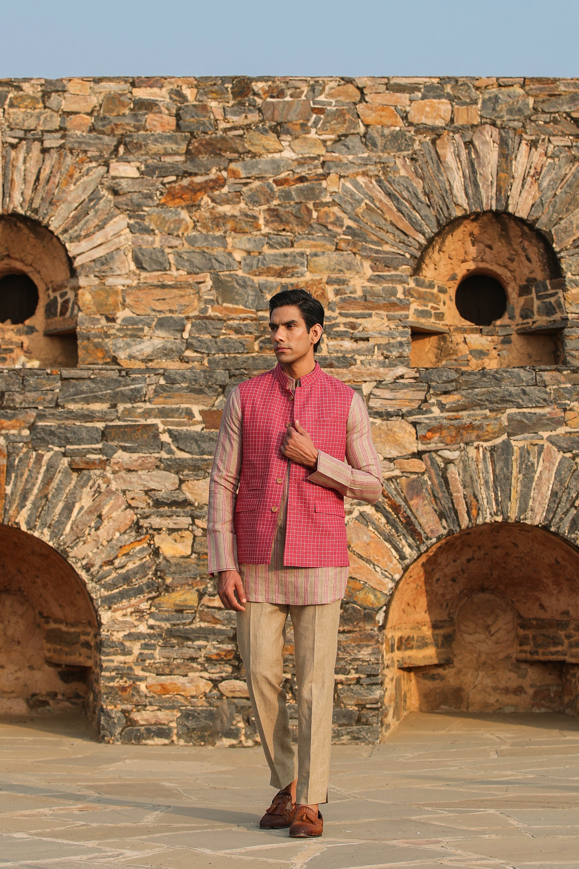 The Design includes a uniquely crafted Checkered Bandi with back yoke and beige piping with 3 flap pockets and double side vent.
